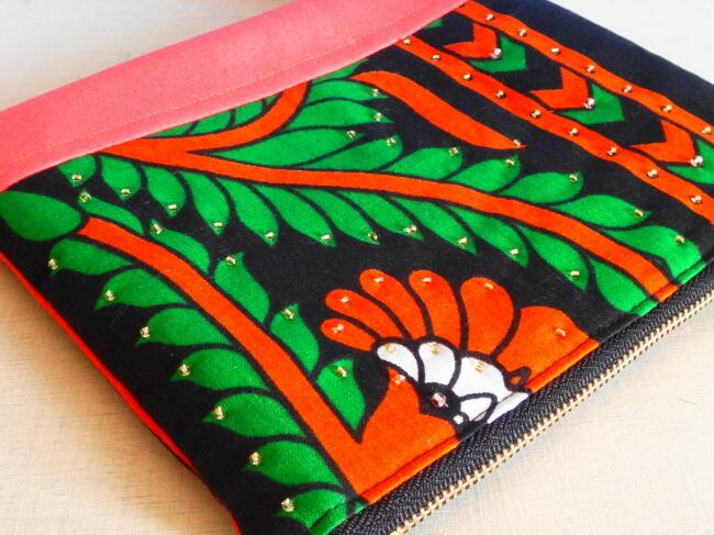 黒地にオレンジの花が鮮やかで目を引くカンガと帆布を組み合わせたぺたんこポーチです。