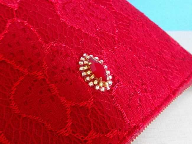 目の覚めるカラーのレース生地を使った華やかポーチできました。