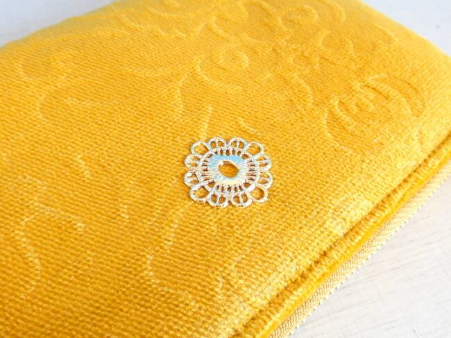 メタルのお花で華やかさを添えたポーチに仕立てました。