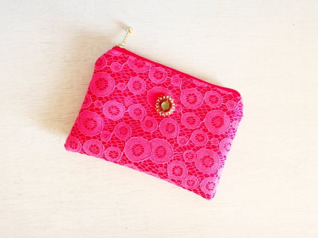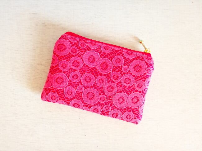 目の覚めるようなカラーのレース生地を使った華やかポーチできました。