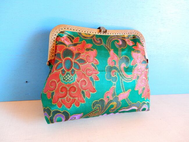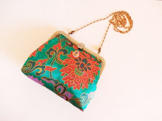深いエメラルドグリーンに赤みのあるコーラルピンク、薄紫の花柄です。