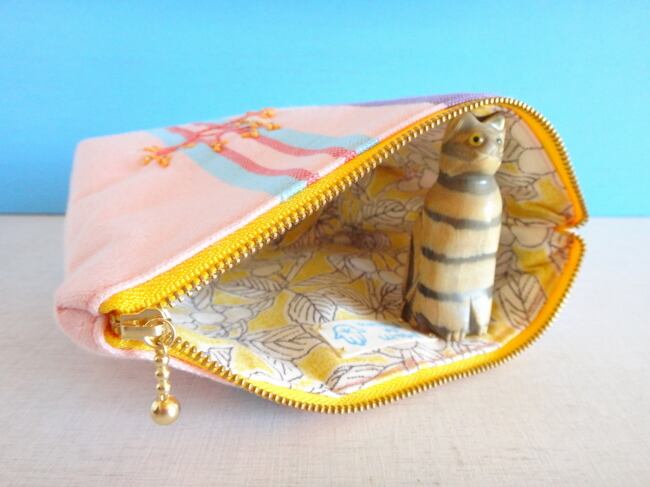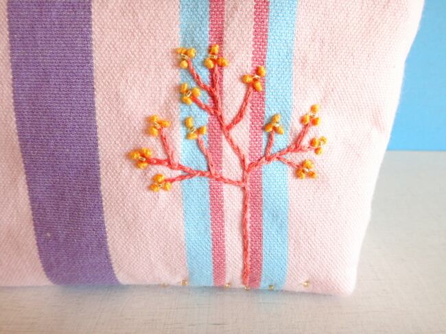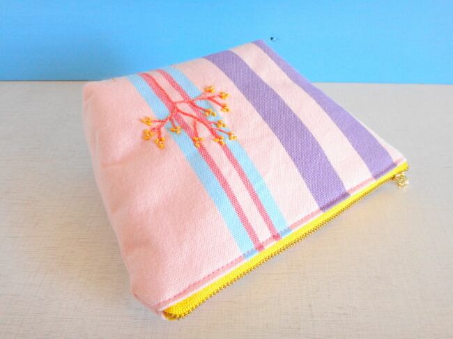 カラフルな縞模様の生地に刺繍をそえてポーチにしました。