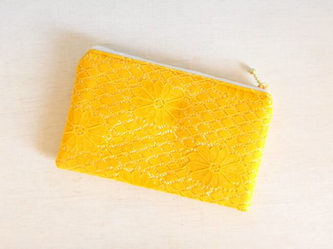 目の覚めるようなカラーのレース生地を使った華やかポーチできました。
