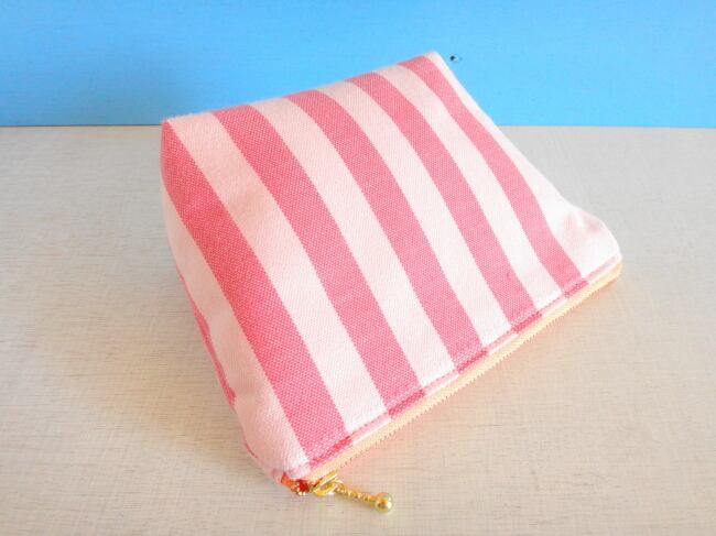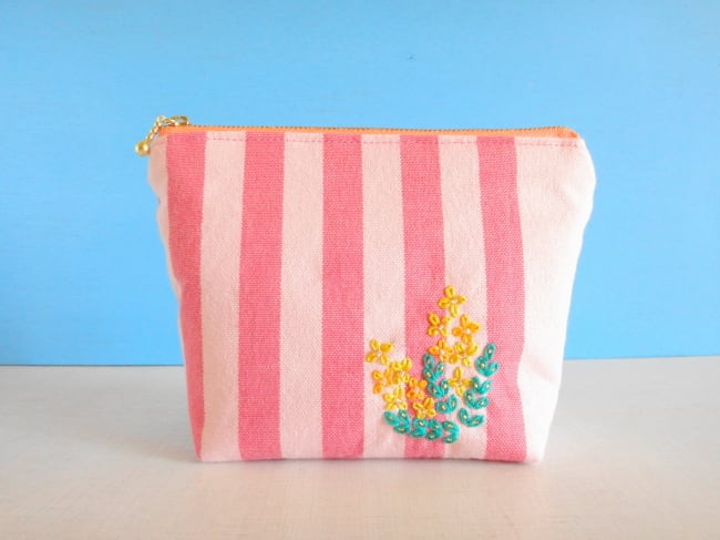 カラフルな縞模様の生地に刺繍をそえてポーチにしました。