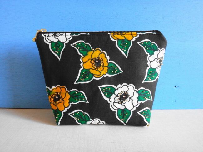 黒地に鮮やかなお花が目を引くカンガのポーチです。