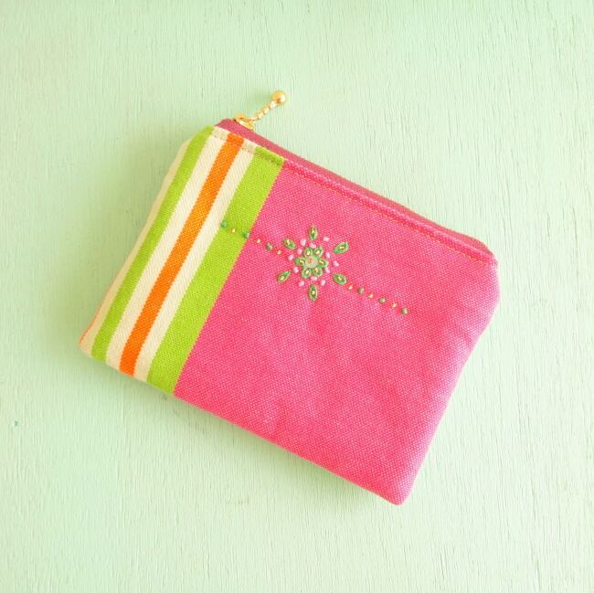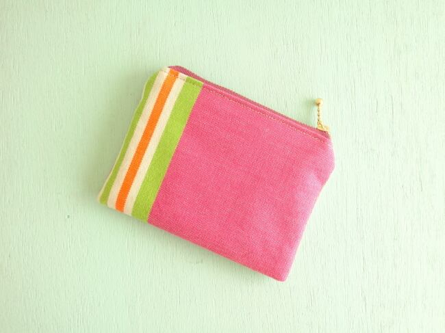 縞縞の上にお花の咲いた、カラフルミニポーチできました。
