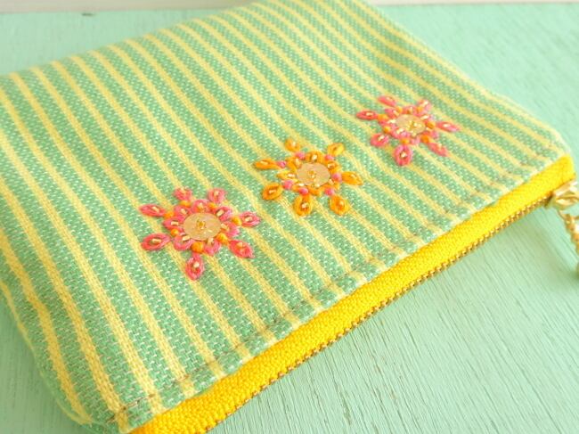 縞縞の上にお花の咲いた、カラフルミニポーチできました。