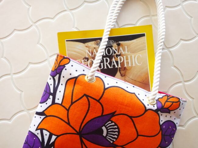 鮮やかなオレンジのお花が目を引くアフリカ布をバッグに仕立てました。