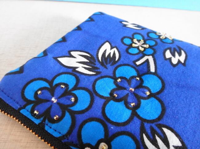 涼し気な青い波にお花が漂うような、アフリカンカンガのポーチです。