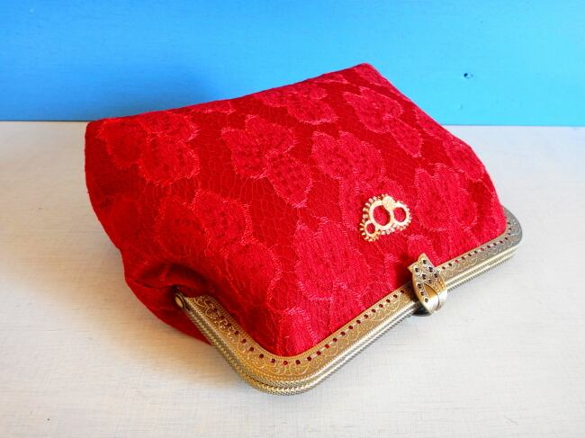 目の覚めるカラーのレース生地をバッグに仕立てました。