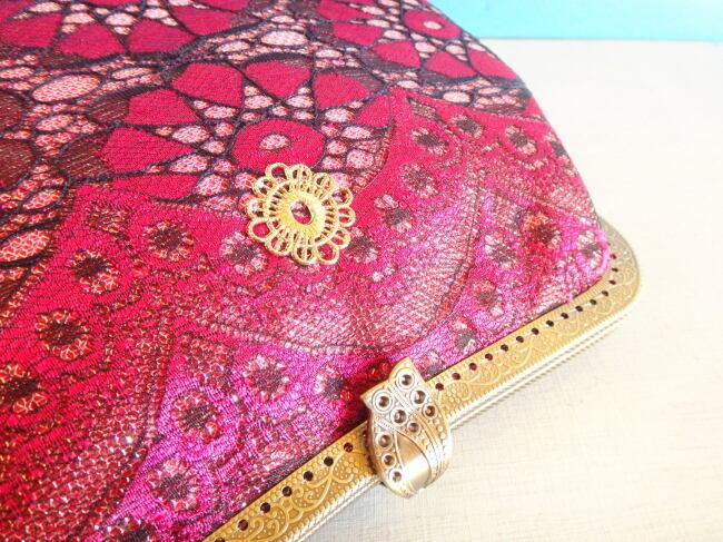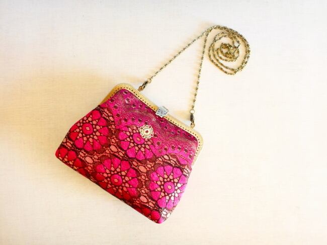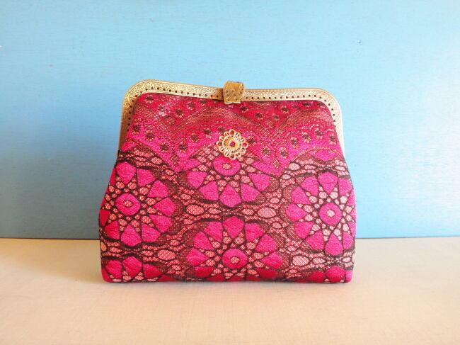 目の覚めるカラーのレース生地をバッグに仕立てました。