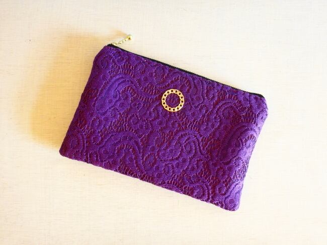 目の覚めるカラーのレース生地を使った華やかポーチできました。